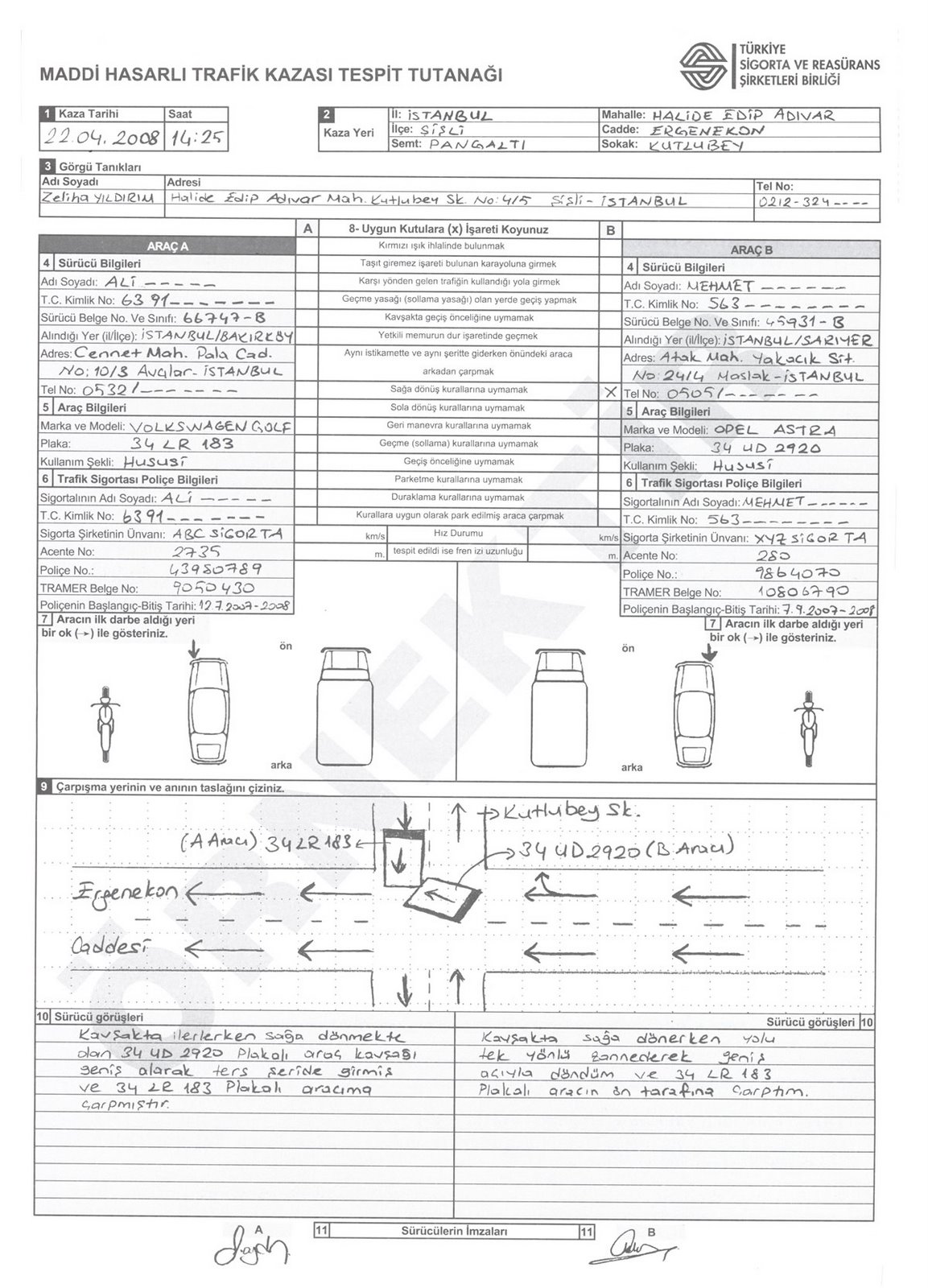 Anlaşmalı kaza tespit tutanağınızı sigorta acentanıza ya da sigorta şirketinizin merkezine gönderebilirsiniz. Kaza tespit tutanağı için tıklayın.